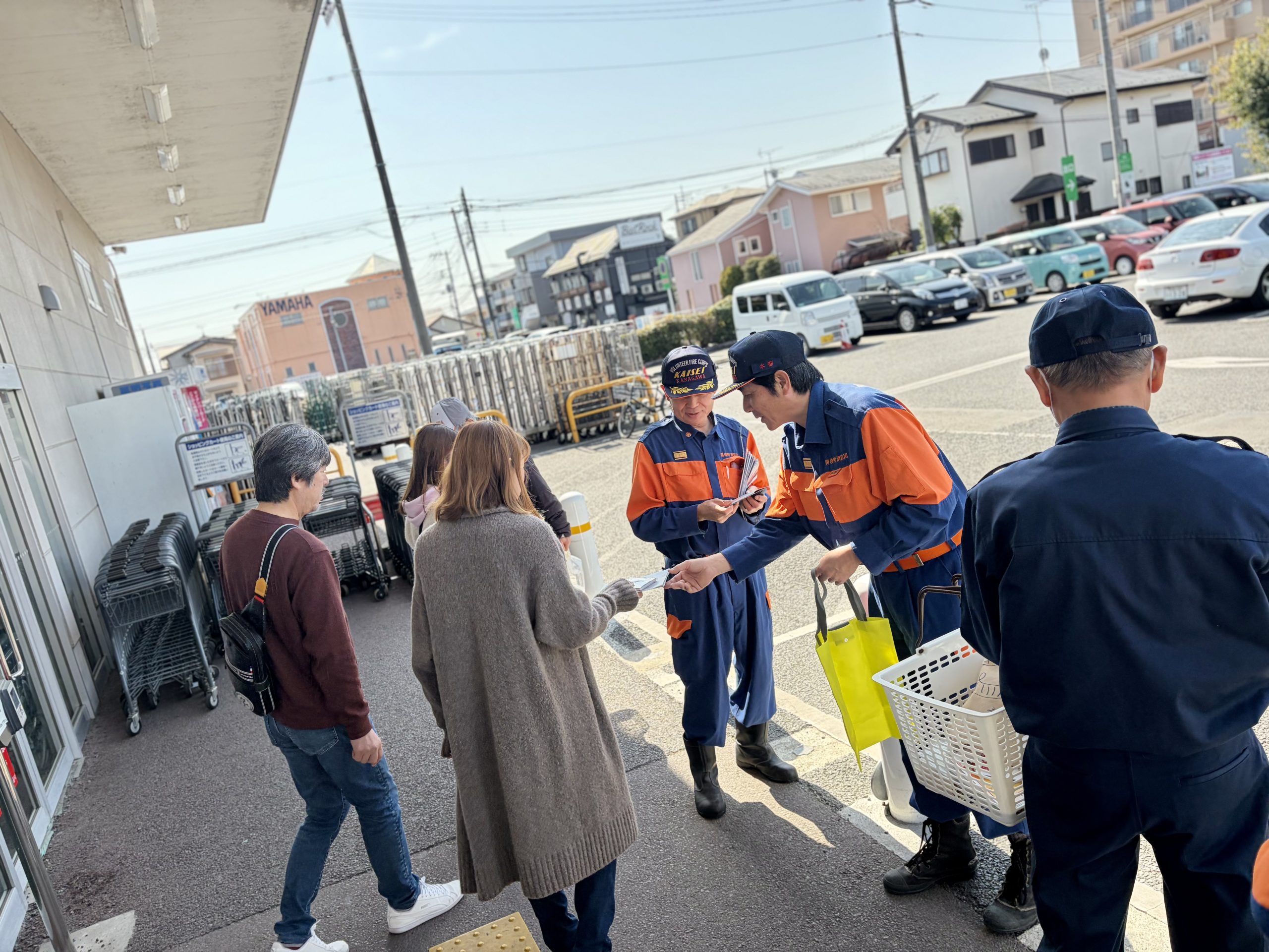 さらに、3月1日(日)には春の火災予防運動に合わせて、消防友の会(消防団OB)による防火キャンペーンを実施しました。マックスバリュ開成店、マックスバリュ開成駅前店、開成駅前ロータリーの3か所で、防火啓発活動を行うとともに、消防団員募集の案内も行いました。今年はオリジナルのマグネットシートを配布しました。